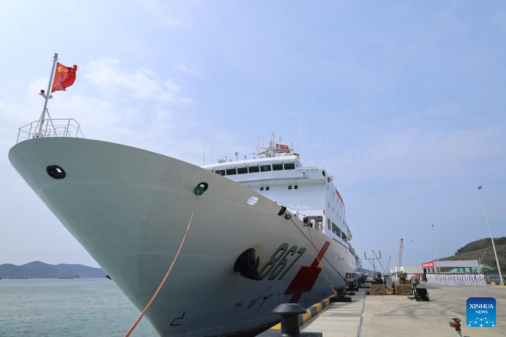 The Chinese People's Liberation Army (PLA) Navy hospital ship, Silk Road Ark, is docked at a military port in Sanya, south China's Hainan Province, April 26, 2026. (Photo by Cui Xiaoyang/Xinhua)