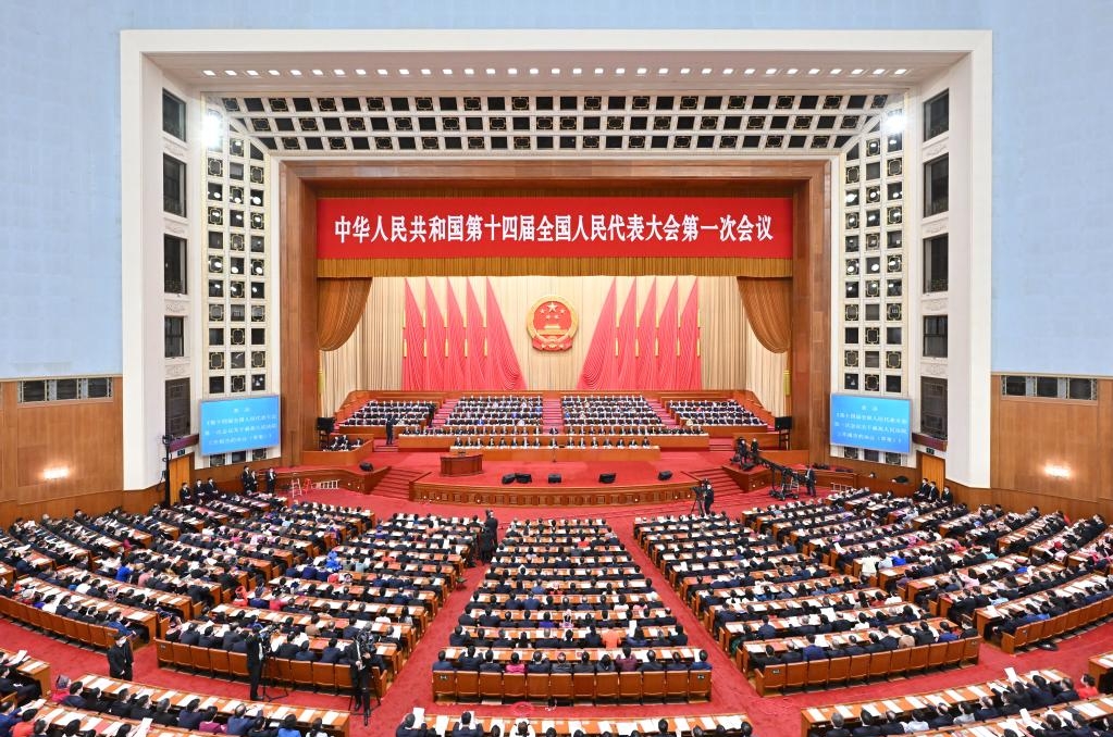 The 14th National People's Congress, China's national legislature, held the fifth plenary meeting of its first session Sunday morning in Beijing.