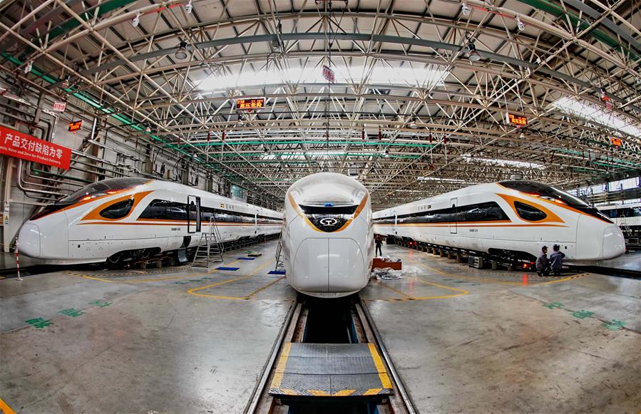 People work on an assembly line of the "Fuxing" bullet train set at Chinese company CRRC Tangshan Co., Ltd in Tangshan, north China's Hebei Province, on March 23, 2018. [Photo/Xinhua]