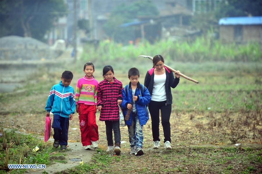 Liang Lina and four students from her village walk back to Luhe Village in Wushi Township of Luchuan County, south China's Guangxi Zhuang Autonomous Region, Feb. 25, 2013. [Photo/Xinhua]
