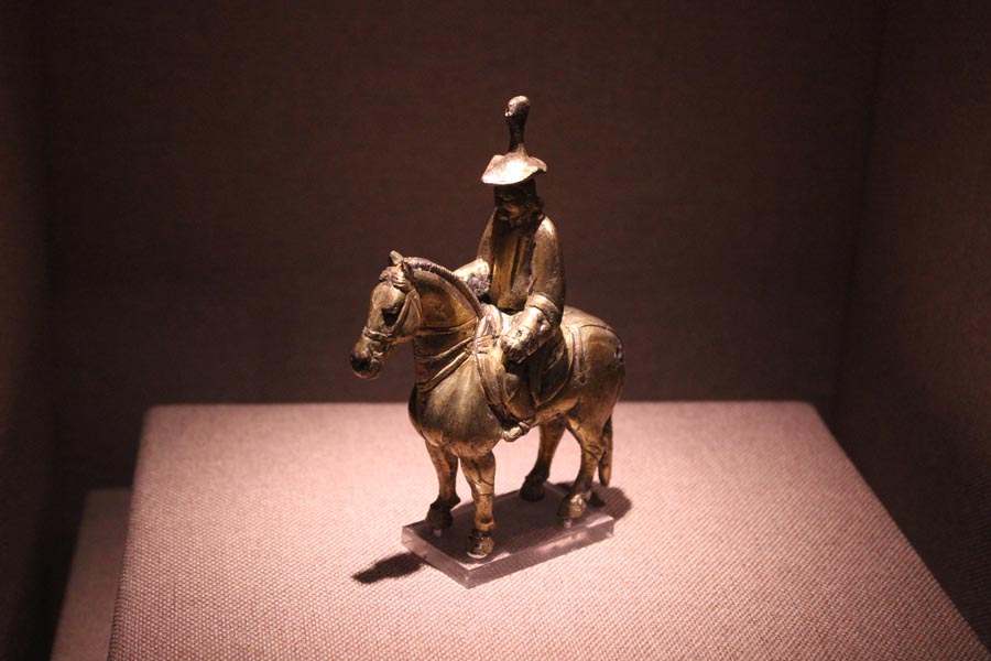 The exhibition hall is a glittering world. A burial mask with engraved animals, a figurine of a rider on horseback, a brooch inset with turquoise, amethyst and aquamarine-all made of gold-all demonstrate, not just the prosperity of that ancient era on the plateau, but its different facets.