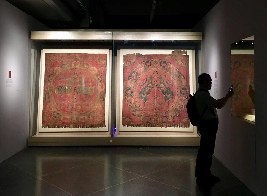 A pair of Central Asian hanging silk brocade at the exhibition. [Photo provided to China Daily]