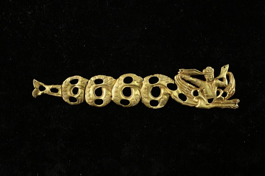 A gold plaque depicting a merman-type character, unearthed from a Tubo graveyard in Dulan county, Qinghai province, is among exhibits about the Tubo regime at an ongoing show in Dunhuang. [Photo provided to China Daily]