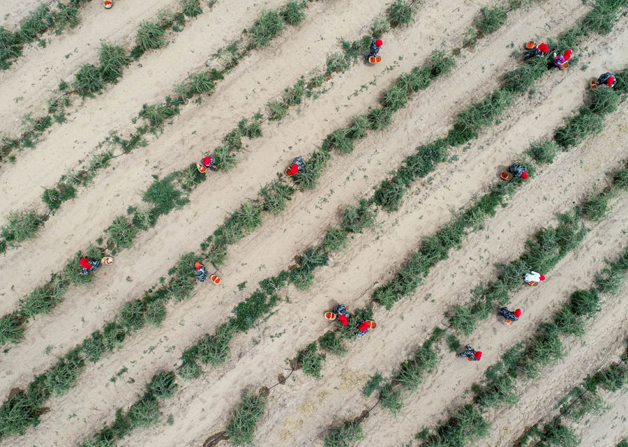 An aerial view of workers picking goji berries at a plantation in Wuzhong, NIngxia. [Photo/Xinhua]