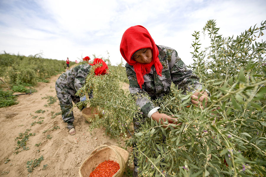Workers pick goji berries at a plantation in Wuzhong, Ningxia Hui autonomous region. [Photo/Xinhua]