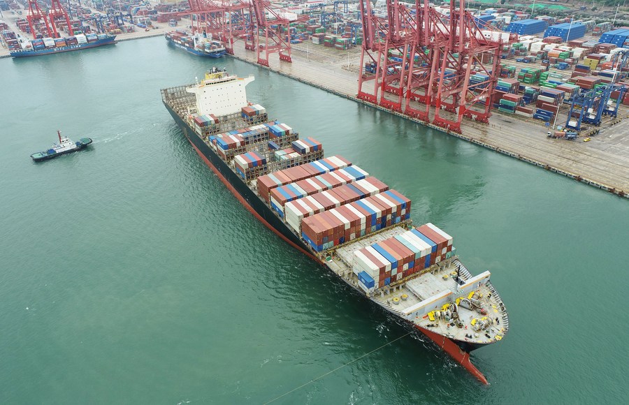 A ship loaded with cargoes leaves a container terminal in Lianyungang, east China's Jiangsu Province, July 13, 2021. (Photo by Wang Jianmin/Xinhua)