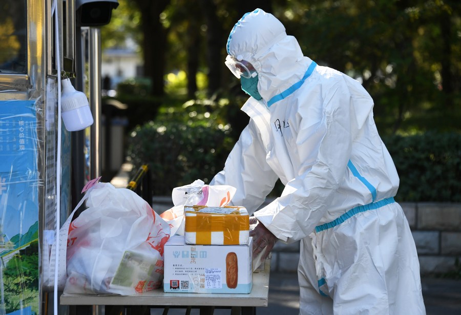 A staff member sorts out delivery packages at Furongli residential community, which has been put under quarantine amid a recent COVID-19 outbreak, in Haidian District in Beijing, capital of China, Oct. 27, 2021. (Xinhua/Ren Chao)