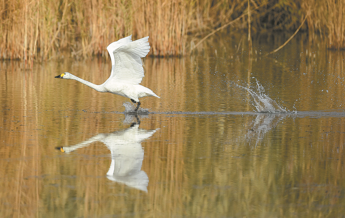 A swan takes off from Ulan Suhai Lake in Inner Mongolia in 2020. [Photo/Xinhua]