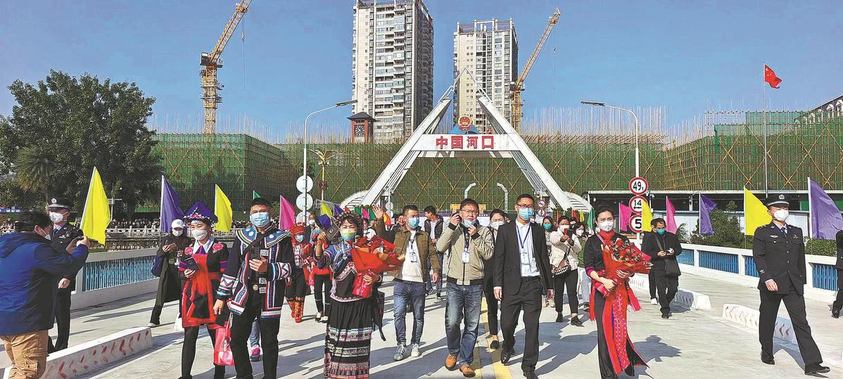 Inbound travelers cross the China-Vietnam Nanxi River Bridge at Hekou Port, Yunnan province, on Sunday. The port is the largest in Yunnan on the Vietnamese border. [Li Xiaopei/For China Daily]