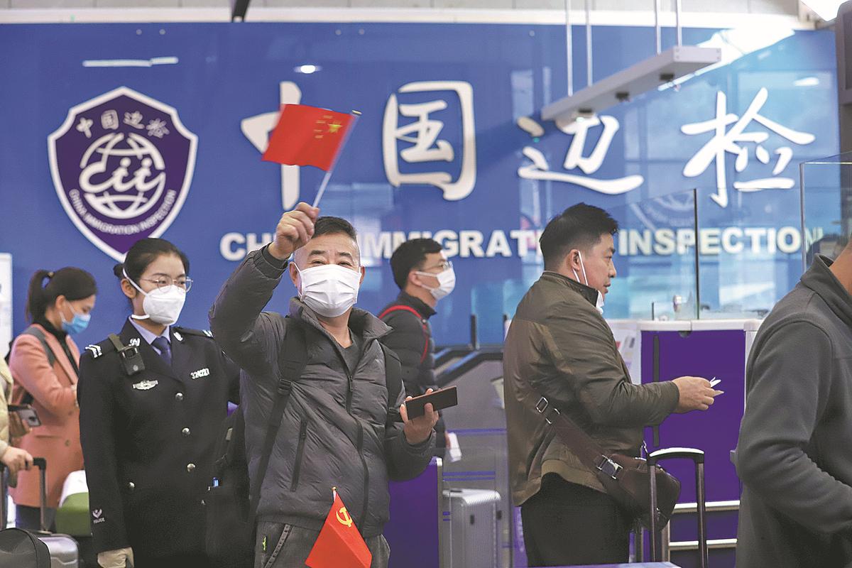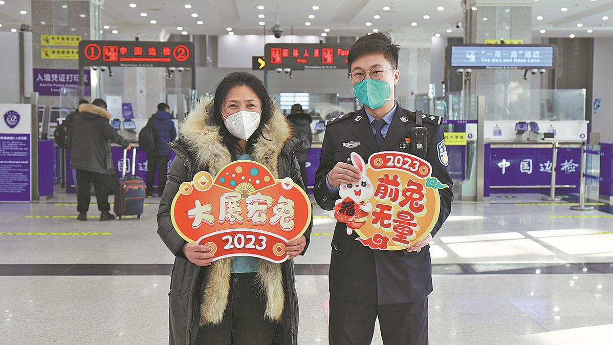 Customs officers welcome inbound travelers at Manzhouli Port, Inner Mongolia autonomous region. [Anjila/For China Daily]
