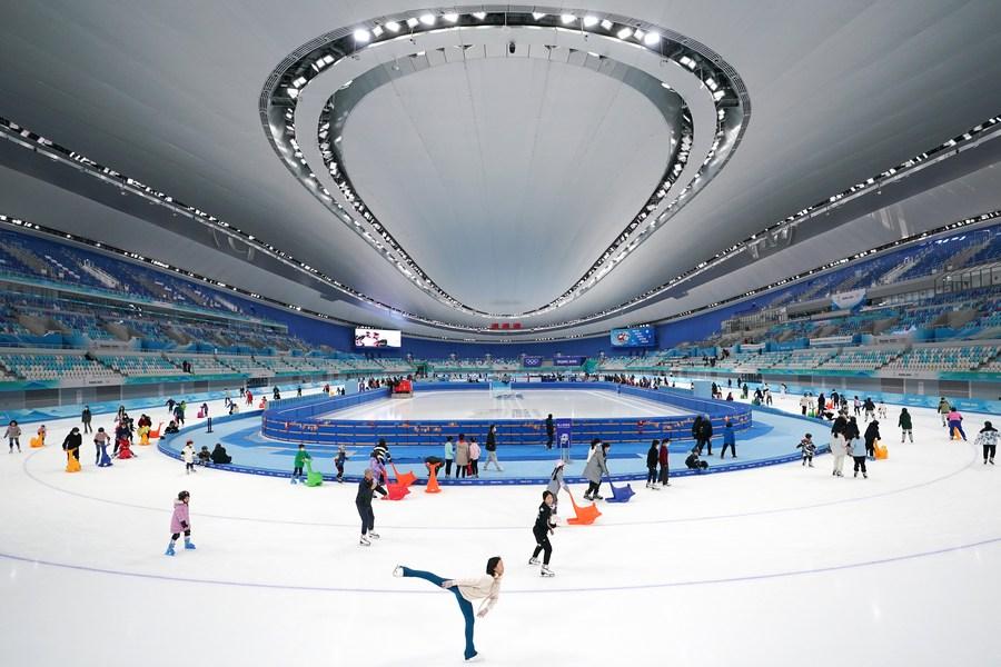 People enjoy skating at the National Speed Skating Oval in Beijing, capital of China, Jan. 30, 2023. (Xinhua/Ju Huanzong)