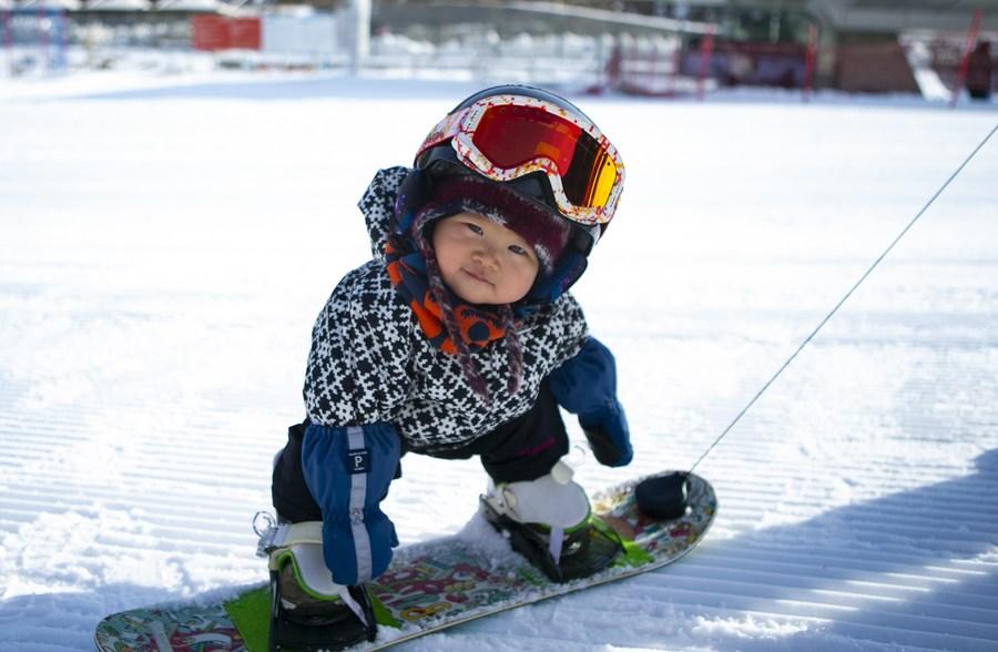 Eleven-month-old girl Wang Yuji enjoys snowboarding at Thaiwoo Ski Resort in Chongli District of Zhangjiakou, north China's Hebei Province on Nov. 18, 2021. (Xinhua/Zhang Fan)