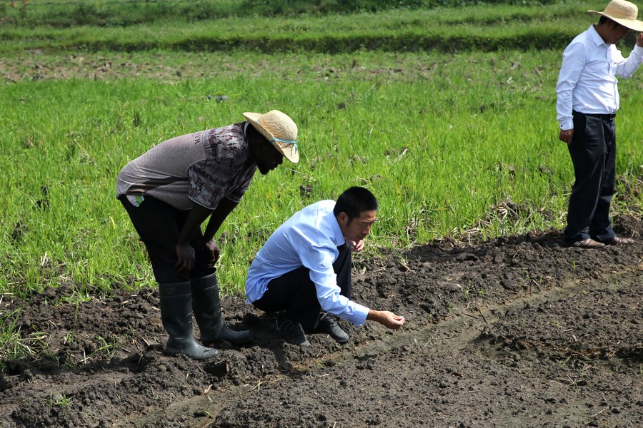 A Chinese agricultural expert inspects rice production in Ninga Village, Bubanza Province, Burundi, on March 12, 2019. (Xinhua/Lyu Tianran)