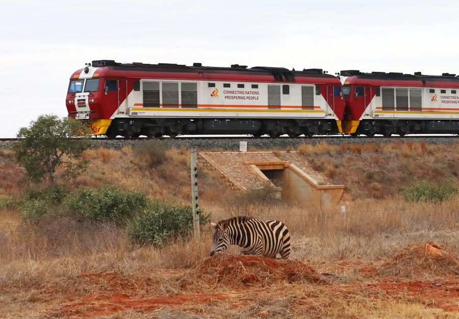 A zebra is seen next to a fence as a freight train runs on the Mombasa-Nairobi Railway track in Kenya, on July 28, 2022. (Xinhua/Dong Jianghui)
