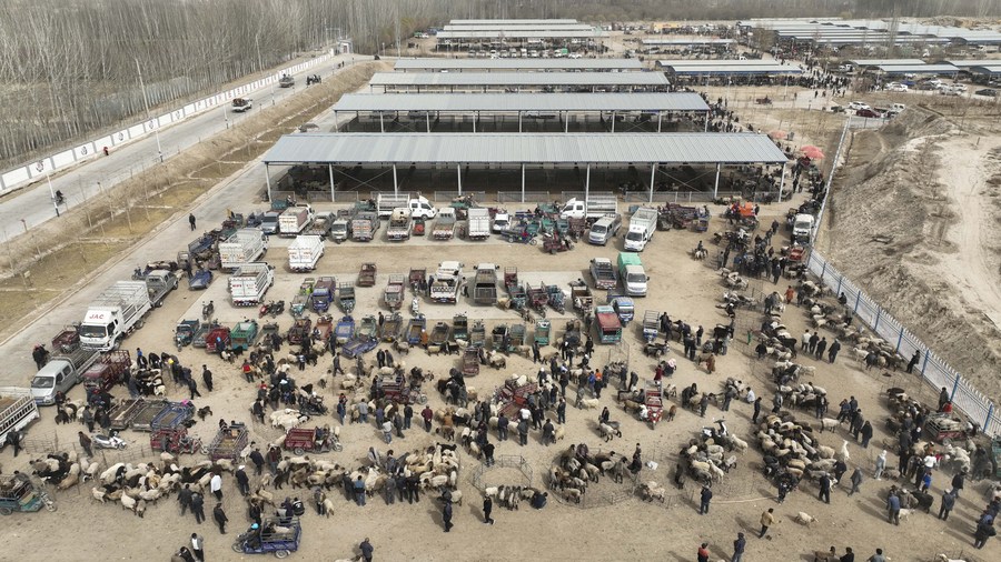 This aerial photo taken on March 12, 2023 shows a view of a livestock bazaar in Mixa Township of Shache County, northwest China's Xinjiang Uygur Autonomous Region. (Xinhua/Li Xiang)