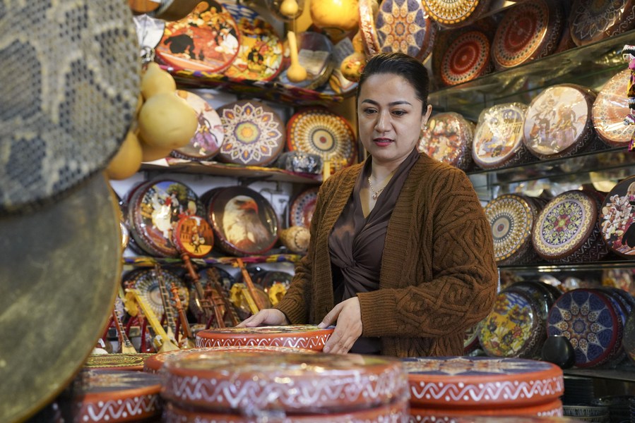 Maira Abletti arranges goods at her ethnic instruments shop at the Xinjiang International Grand Bazaar in Urumqi, northwest China's Xinjiang Uygur Autonomous Region, March 27, 2023. (Xinhua/Aman)