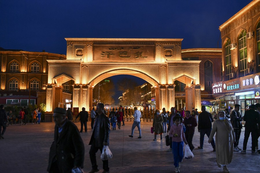 This photo taken on March 9, 2023 shows the night view of Khan Bazaar in the ancient city of Kashgar, northwest China's Xinjiang Uygur Autonomous Region. (Xinhua/Hu Huhu)