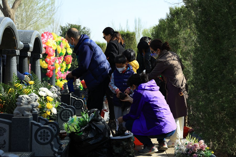 People pay tribute to the deceased at the Songhe cemetery in Yinchuan, northwest China's Ningxia Hui Autonomous Region, April 1, 2023. (Xinhua/Yang Wenxi)