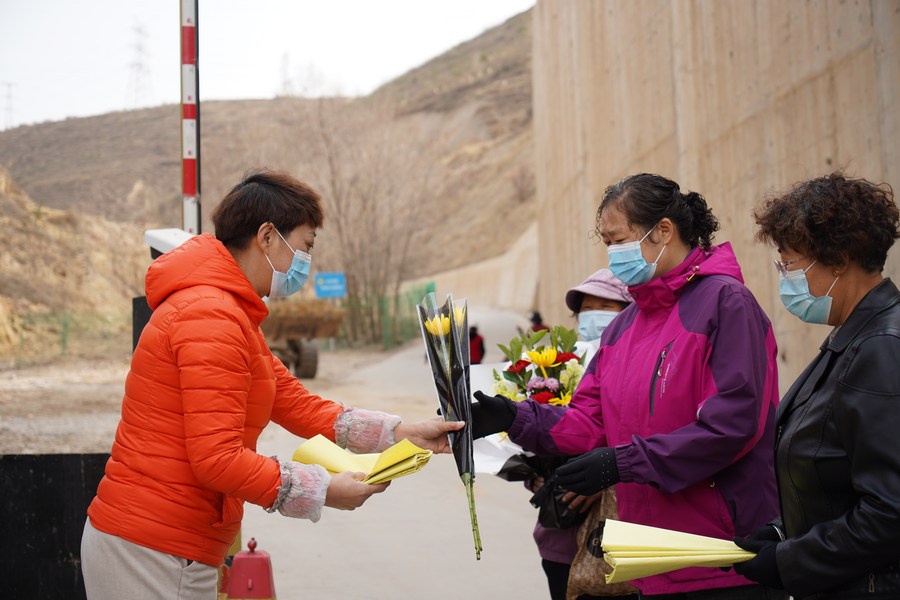 A staff member (1st L) exchanges villagers' joss paper with fresh flowers in Yanzhuang Village, Xining City, northwest China's Qinghai Province, March 31, 2022. (Xinhua/Zhang Ziqi)