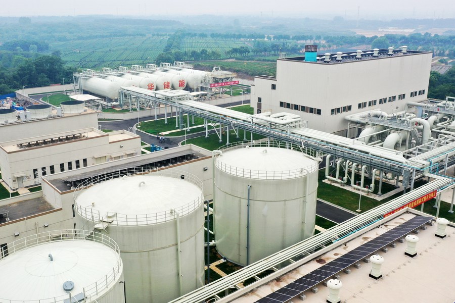 Aerial photo taken on May 26, 2022 shows a salt cavern compressed air energy storage in Changzhou City, east China's Jiangsu Province. (Photo by Hu Ping/Xinhua)