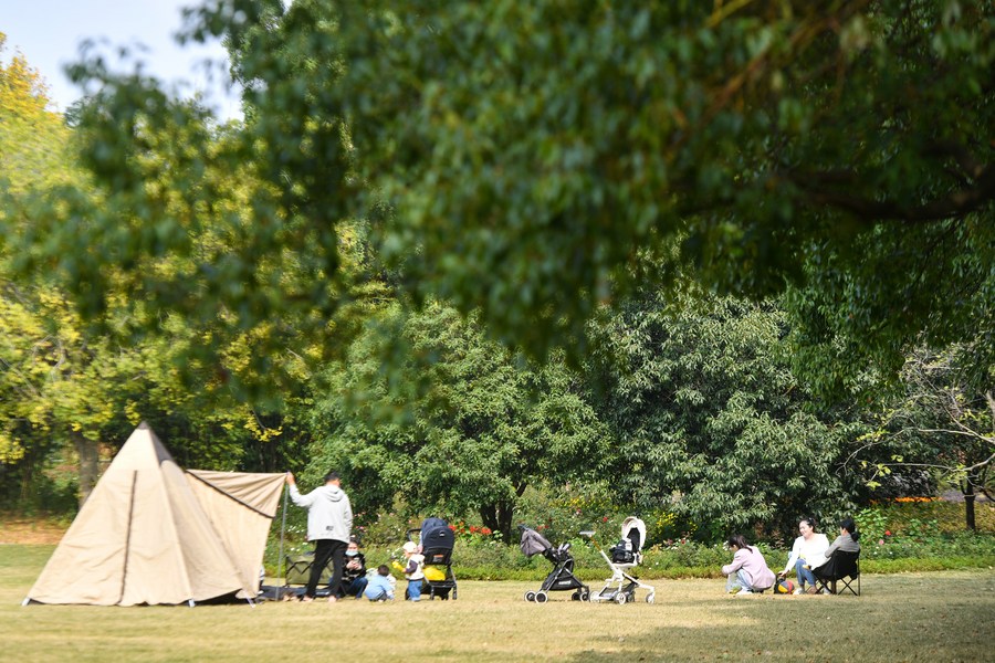 People enjoy camping at the Donghu Lake scenic area in Wuhan, central China's Hubei Province, Nov. 5, 2022. (Xinhua/Sun Ruibo)