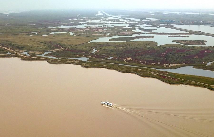 This aerial photo taken on Oct. 12, 2023 shows a view of the Yellow River Delta National Nature Reserve in Dongying, east China's Shandong Province. (Xinhua/Xu Suhui)