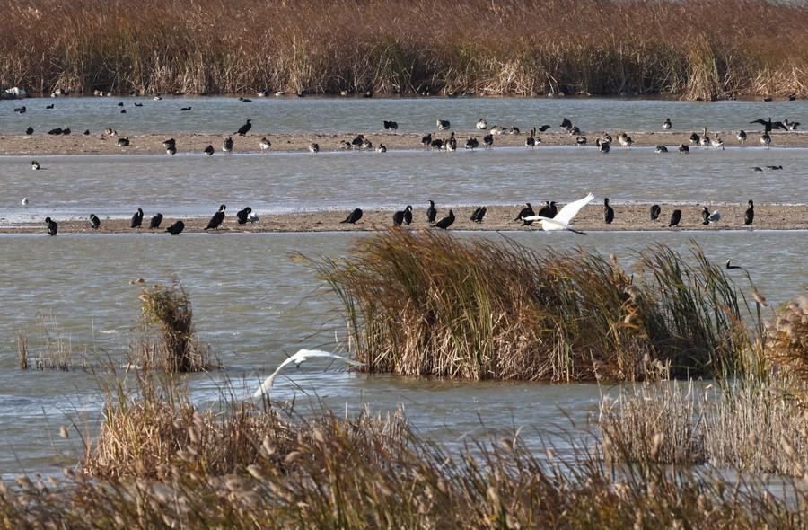 Wintering migratory birds are seen at the Yellow River Delta National Nature Reserve in Dongying, east China's Shandong Province, Nov. 12, 2023. (Xinhua/Xu Suhui)