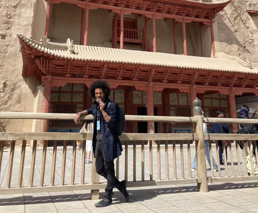 Zachary Iziah Smith, an American travel blogger, poses for a photo at Mogao Grottoes in Dunhuang, northwest China's Gansu Province, April 11, 2025. (Xinhua)