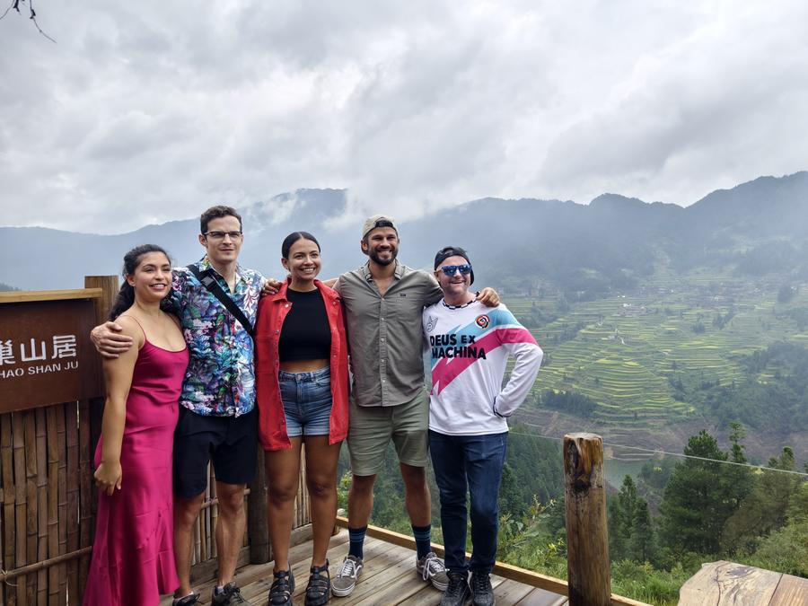 Tom Peacock-Nazil (2nd R) and other tourists pose for a photo in Leishan County, southwest China's Guizhou Province, in September 2024. (China Explorer Tour/Handout via Xinhua)