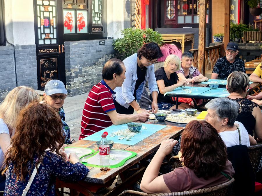 Foreign tourists learn to make traditional wheaten food at a homestay in Pingyao, north China's Shanxi Province, May 15, 2025. (Photo by Qiao Yan/Xinhua)