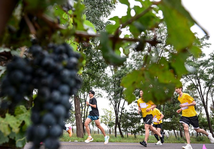 Athletes run past a wine grape plantation during a half-marathon in northwest China's Ningxia Hui Autonomous Region, on Sept. 16, 2024. (Xinhua/Feng Kaihua)