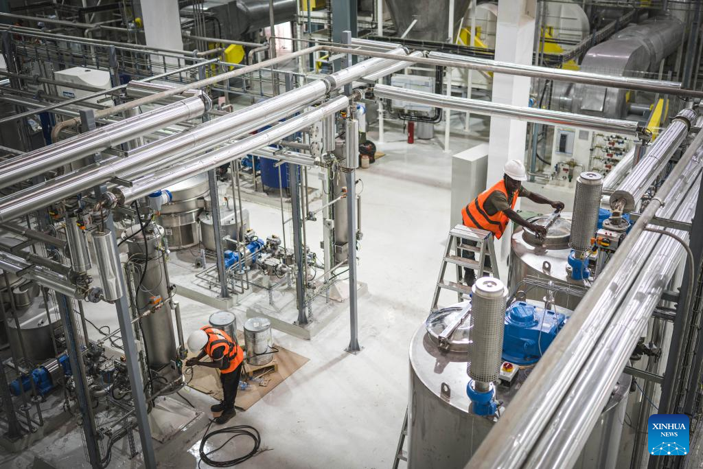 This photo taken on May 27, 2025 shows workers checking cocoa processing equipment at the cocoa processing complex in the PK24 Industrial Park on the northwestern outskirts of Abidjan, Cote d'Ivoire. (Xinhua/Wang Guansen)