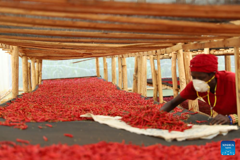 A staff member sorts chili peppers in Nyagatare District, Rwanda, on May 22, 2025. (Xinhua/Ji Li)