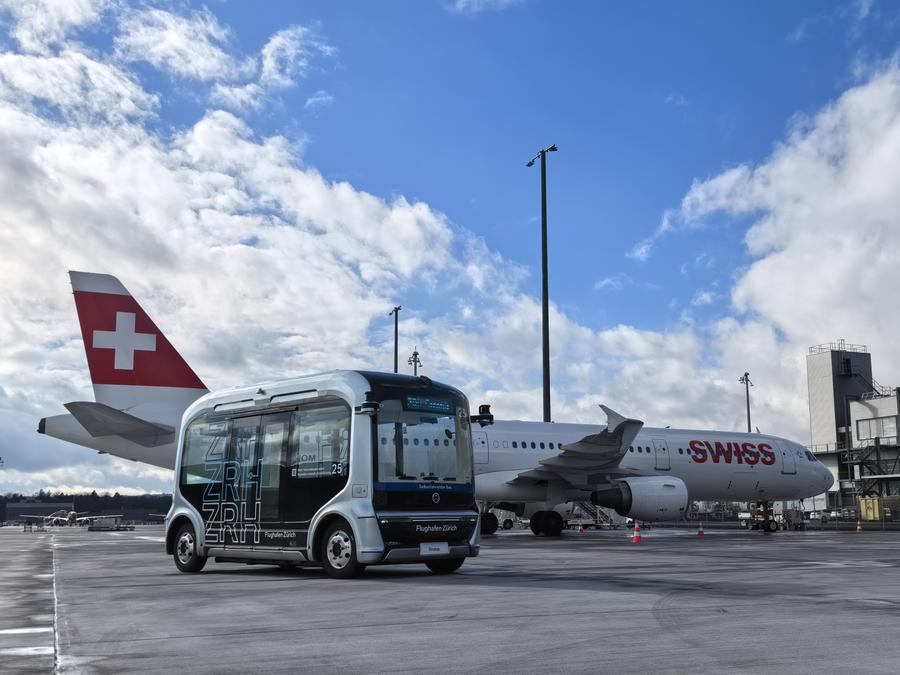 This photo taken on April 17, 2025 shows a China-developed WeRide Robobus (front) operating at an airport in Zurich, Switzerland. (Xinhua)