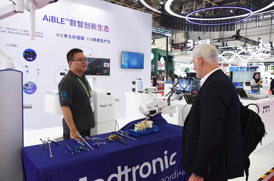 A staff member (L) introduces an orthopedic surgical robot at the Healthy Life Chain area during the third China International Supply Chain Expo (CISCE) in Beijing, capital of China, July 16, 2025. (Xinhua/Ren Chao)