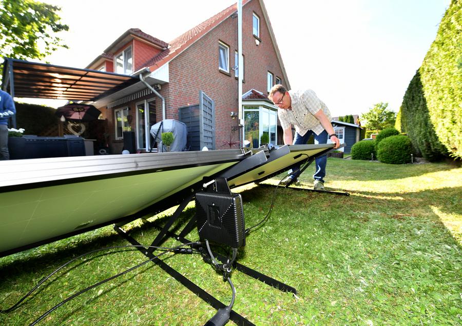 A man checks Chinese-made solar-powered equipment installed at his house in Schwarzenbek, Germany, May 30, 2023. (Xinhua/Ren Pengfei)