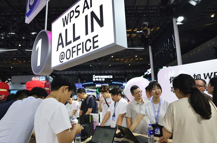 Visitors try the WPS Office AI system at the 2025 World AI Conference in east China's Shanghai, July 27, 2025. (Xinhua/Fang Zhe)