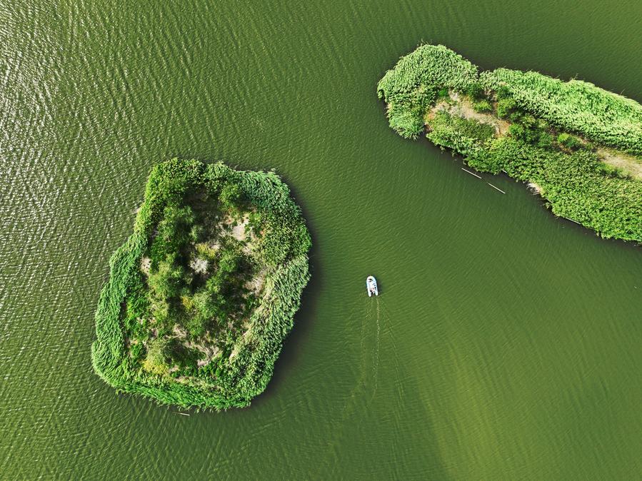 An aerial drone photo taken on June 5, 2025 shows volunteers taking a boat to inspect the breeding habitat of migrant birds at a wetland on the estuary of the Baisha River in Qingdao City, east China's Shandong Province. (Photo by Wang Haibin/Xinhua)
