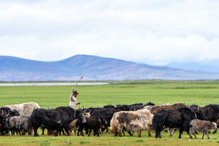 This photo taken on July 22, 2025 shows a herd of yaks in a wetland near Mapam Yumco Lake in Burang County of Ngari Prefecture, southwest China's Xizang Autonomous Region. (Xinhua/Tenzing Nima Qadhup)