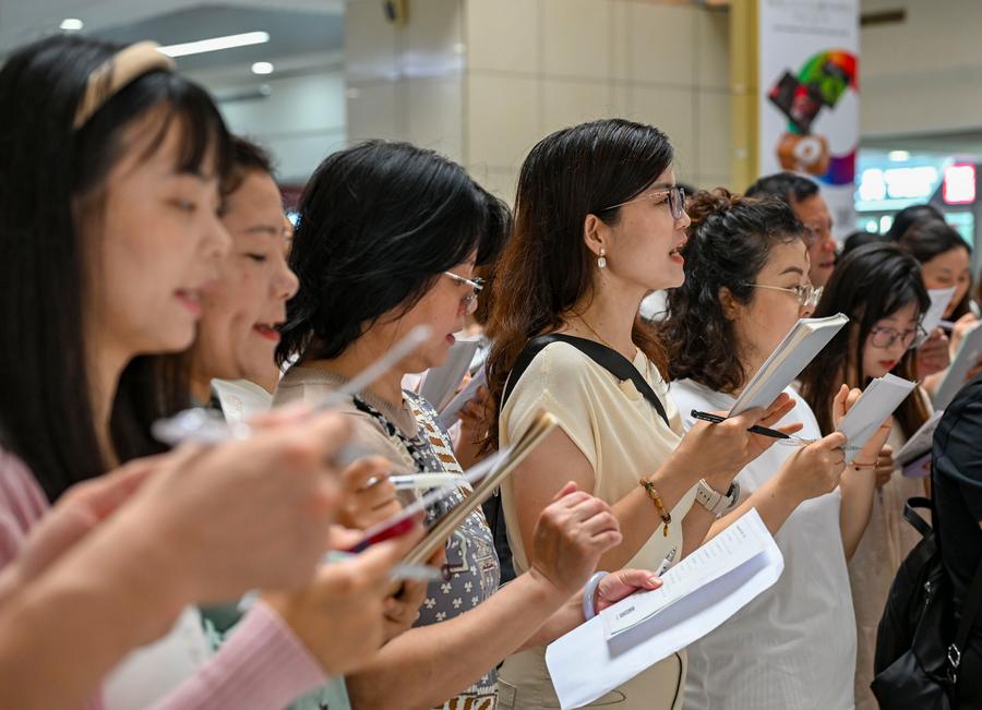 Merchants participate in a language learning session at the Yiwu International Trade Market in Yiwu, east China's Zhejiang Province, May 16, 2025. (Xinhua/Chen Shuo)