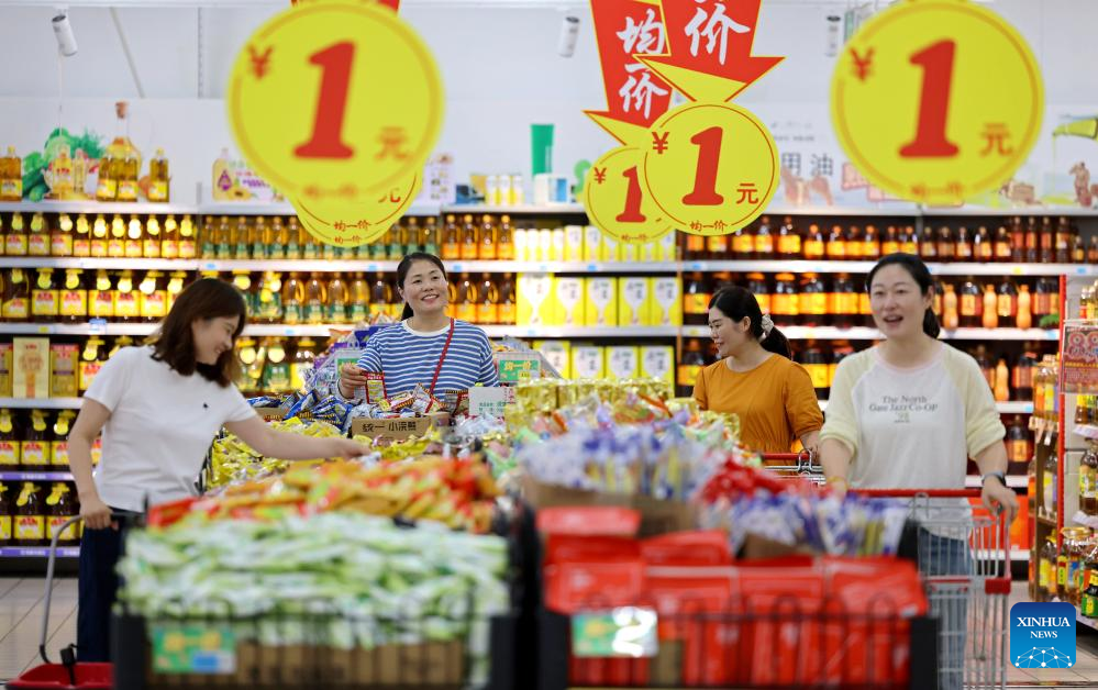 People shop at a supermarket in Zaozhuang City, east China's Shandong Province, Aug. 9, 2025. China's consumer price index (CPI), a main gauge of inflation, climbed 0.4 percent in July compared with the previous month, reversing a 0.1-percent drop in June and exceeding the average seasonal pace of 0.3 percent, data from the National Bureau of Statistics (NBS) showed Saturday. (Photo by Sun Zhongzhe/Xinhua)