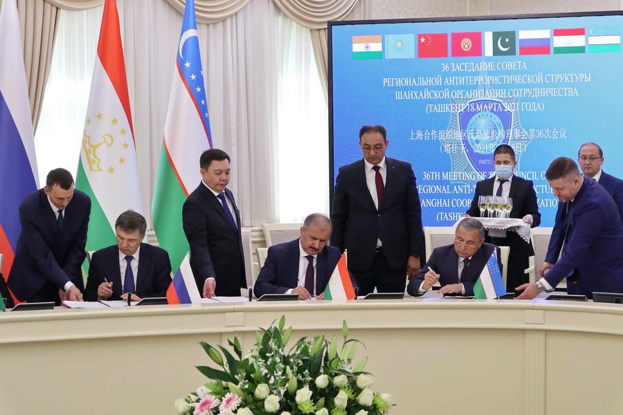 Delegates sign documents at the 36th meeting of the Council of the Regional Anti-Terrorist Structure (RATS) of the Shanghai Cooperation Organization (SCO) in Tashkent, Uzbekistan, March 18, 2021. (Photo by Zafar Khalilov/Xinhua)