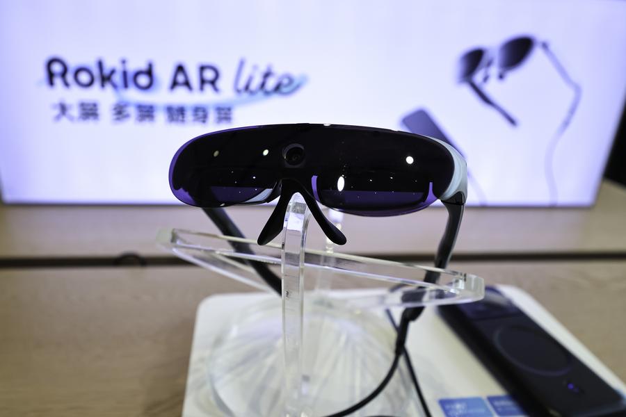 A pair of smart glasses developed by Hangzhou-based technology company Rokid is pictured at Rokid's flagship store in Yujiang District of Yingtan, east China's Jiangxi Province, July 10, 2025. (Xinhua/Liu Jinhai)