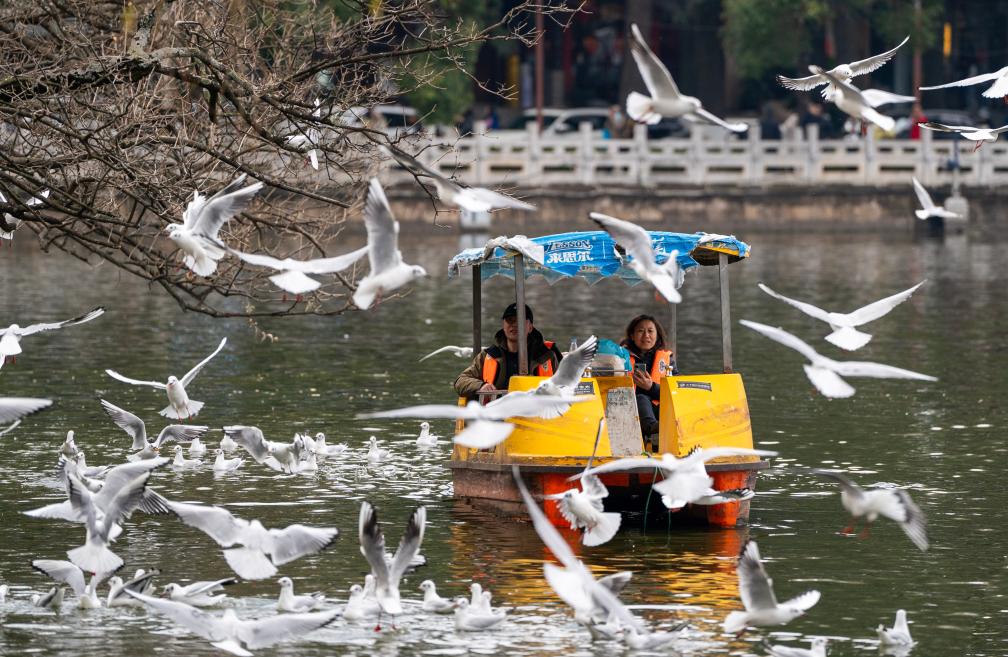 Tourists view gulls during a boat ride at Cuihu Park in Kunming, southwest China's Yunnan Province, Feb. 11, 2024. (Xinhua/Chen Xinbo)