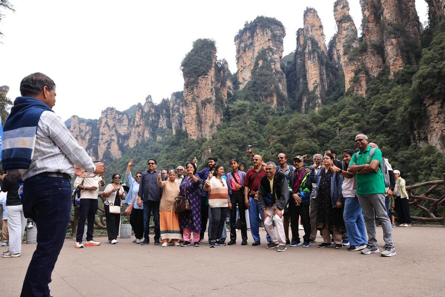 Foreign tourists pose for group photos at the Zhangjiajie National Forest Park in Zhangjiajie, central China's Hunan Province, Oct. 2, 2025. (Photo by Wu Yongbing/Xinhua)