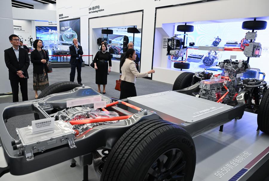 Foreign guests visit an exhibition hall of the headquarters of BYD in Shenzhen, south China's Guangdong Province, July 22, 2024. (Xinhua/Li He)