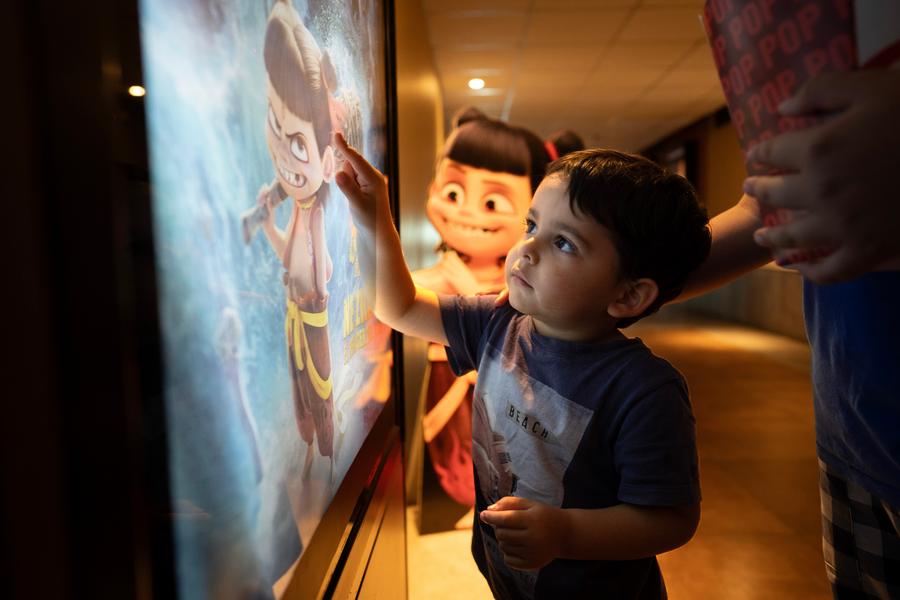 A boy points at a poster for the premiere of Chinese animated film "Ne Zha 2" in a cinema in Buenos Aires, Argentina, on Oct. 2, 2025. (Photo by Martin Zabala/Xinhua)