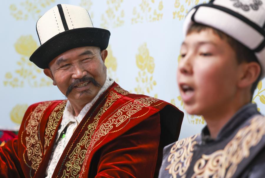 Jangnur Turganbay (L), a renowned inheritor of the "Manas" epic, teaches his apprentice to sing at his home in Artux City, Kizilsu Kirgiz Autonomous Prefecture, northwest China's Xinjiang Uygur Autonomous Region, April 21, 2025. (Xinhua/Wang Fei)