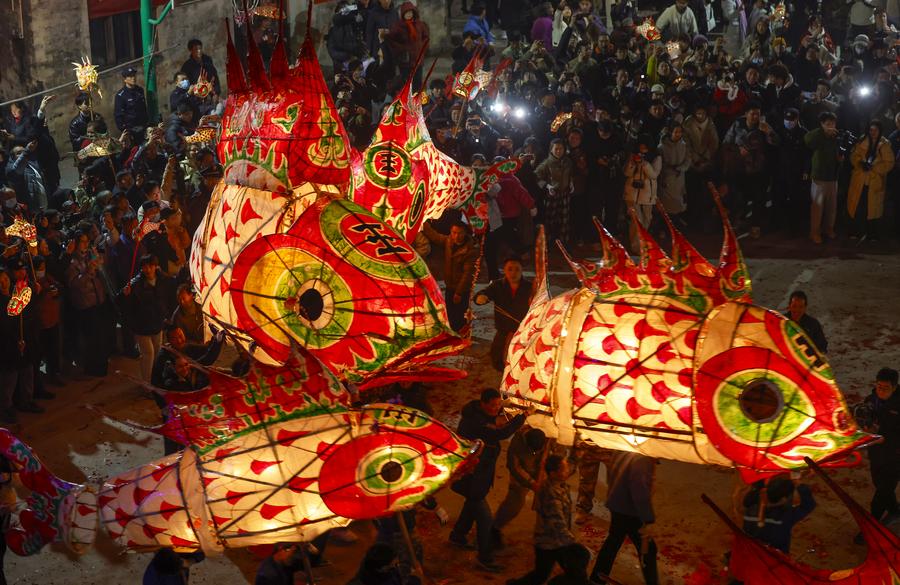 Villagers parade with fish-shaped lanterns in Wangmantian Village of Xitou Town in Shexian County, Huangshan City of east China's Anhui Province, Feb. 10, 2025. (Photo by Shi Yalei/Xinhua)