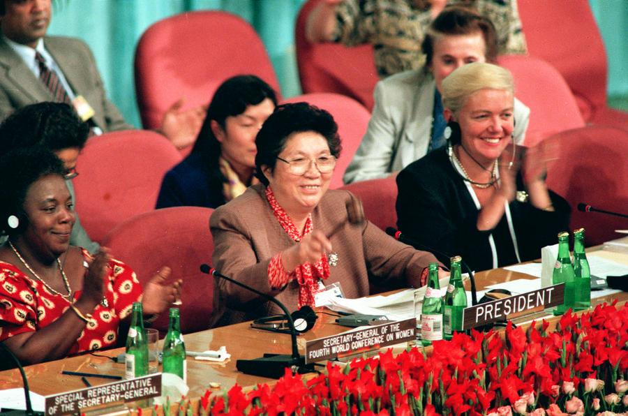 Chen Muhua, president of the UN Fourth World Conference on Women, announces the approval of the "Beijing Declaration" by striking a hammer at its plenary session in Beijing on Sept. 15, 1995. (Xinhua/Yao Dawei)